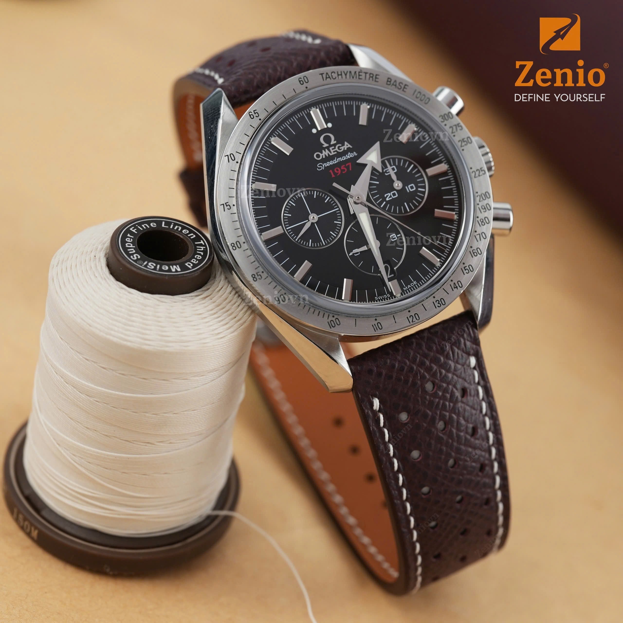 Each stitch is carefully hand-sewn with durable linen thread, ensuring both strength and refined aesthetics. The perforated design adds a sporty touch, making it a perfect match for your Omega Speedmaster or any classic chronograph.-