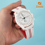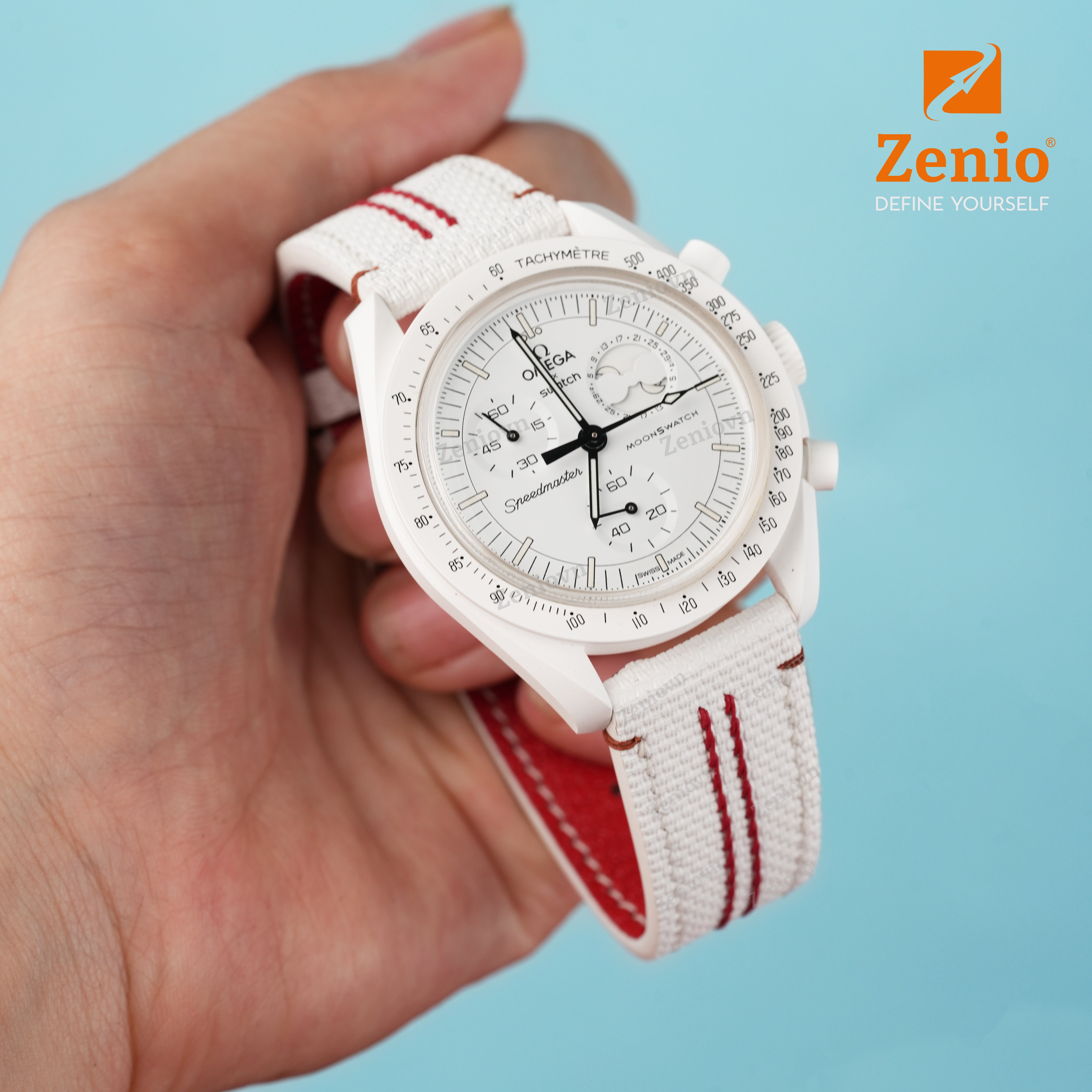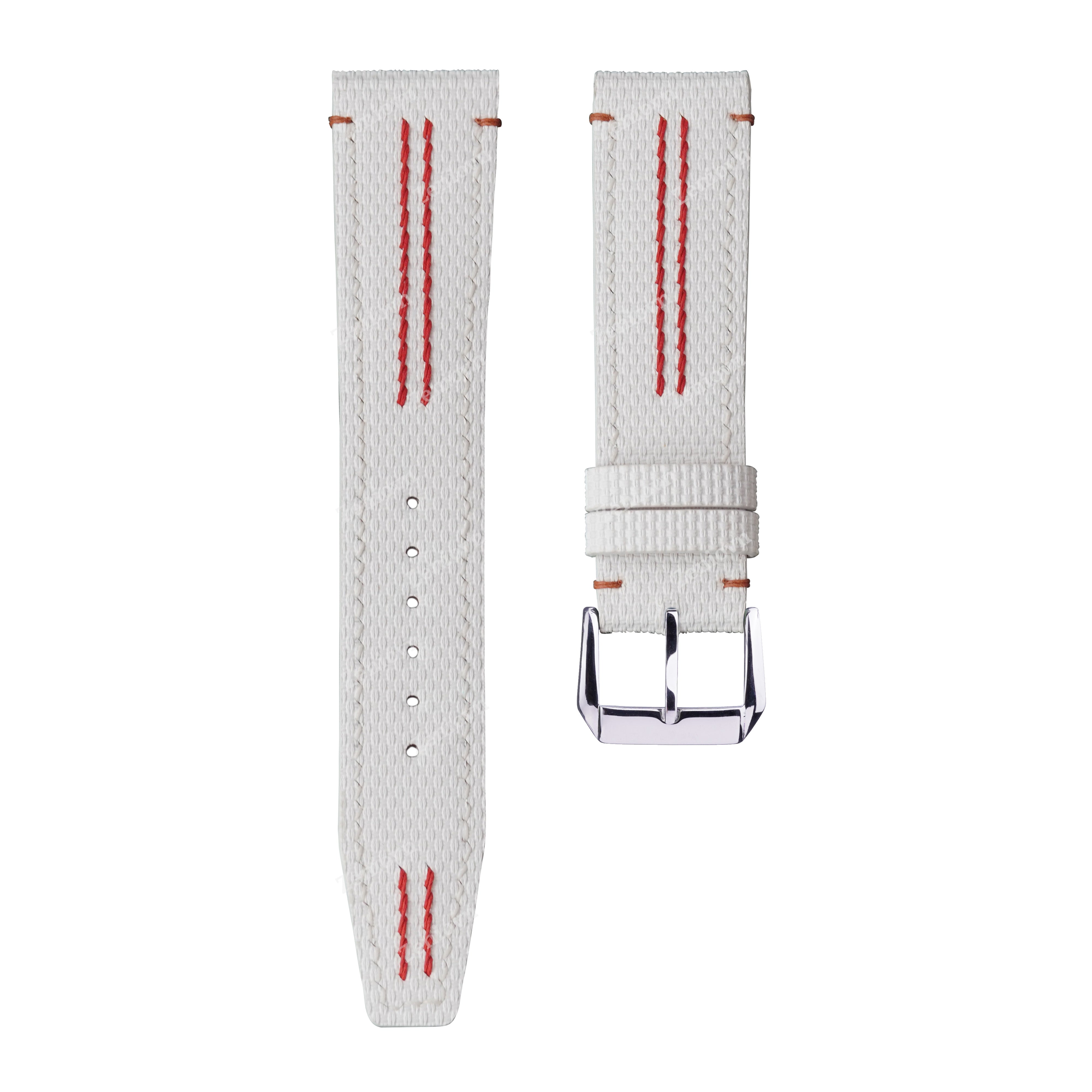 Add a sporty yet refined touch to your timepiece with our White Sailcloth Sport Strap featuring Red Stitching. Crafted with a durable sailcloth outer layer, the strap delivers a clean and energetic look, enhanced by vibrant red stitching.