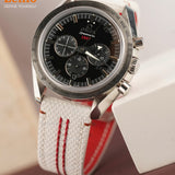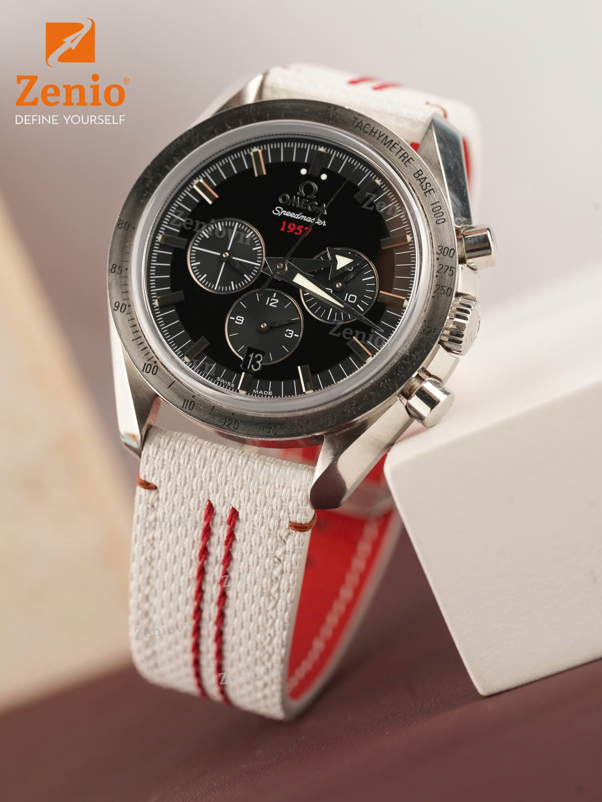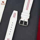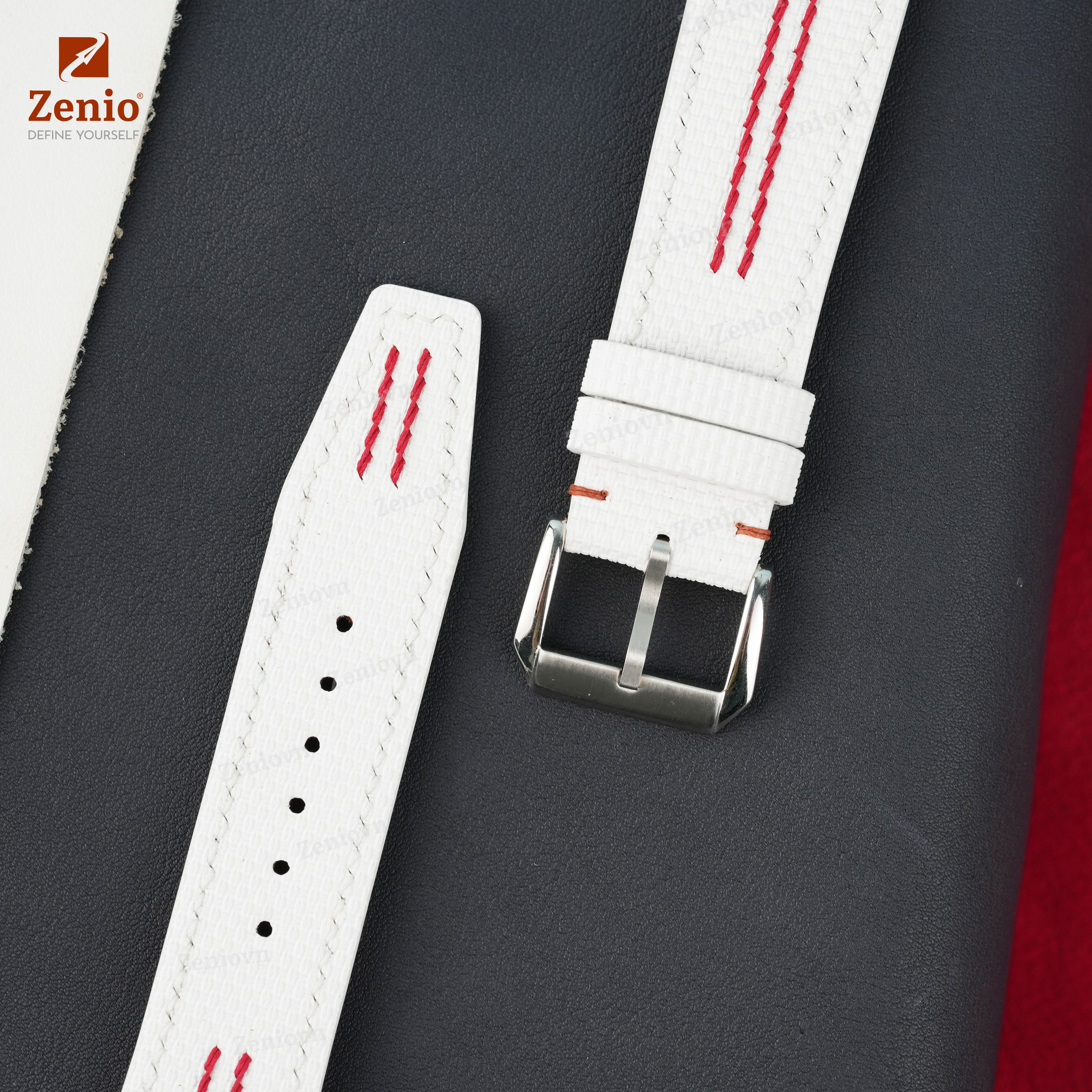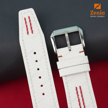 Add a sporty yet refined touch to your timepiece with our White Sailcloth Sport Strap featuring Red Stitching. Crafted with a durable sailcloth outer layer, the strap delivers a clean and energetic look, enhanced by vibrant red stitching.